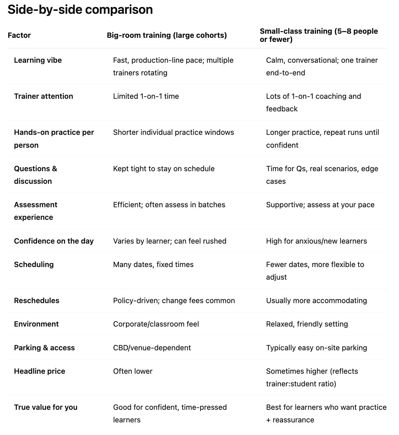 Both options meet national standards when delivered by approved providers. Big‑room training is about speed and lower headline price. Small‑class training maximises trainer attention, practice time and confidence. Choose based on how you learn best, not brands.